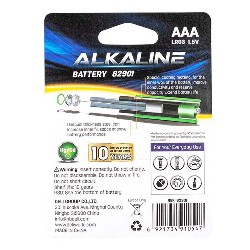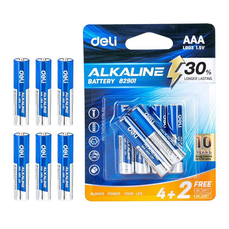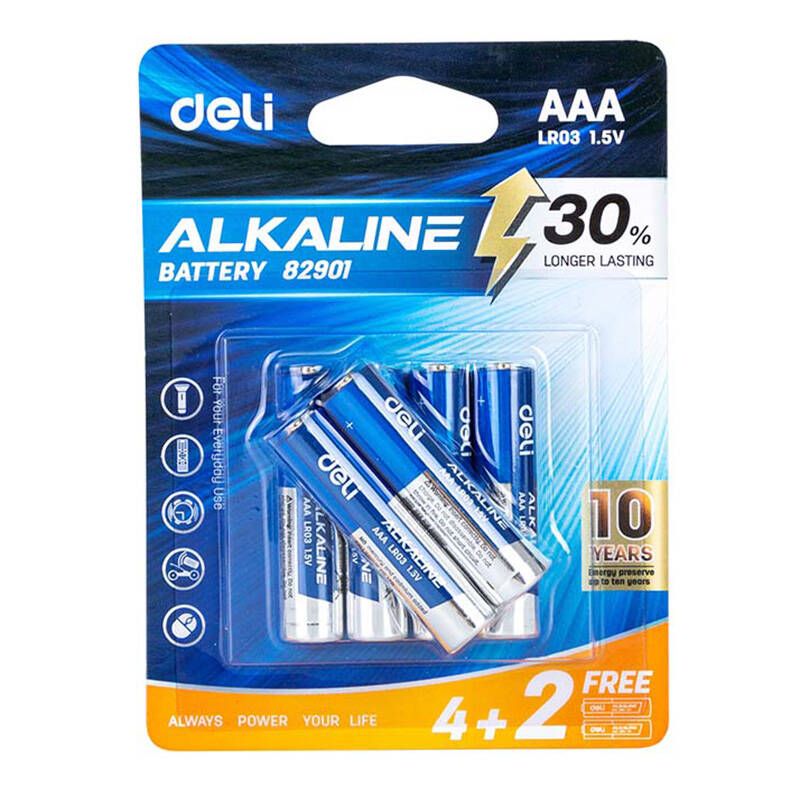 Baterie alkaliczne Deli AAA LR03 1,5 V umożliwiają zasilanie sprzętów codziennego użytku takich jak pilot do telewizora, latarka, mysz komputerowa, zegar, zabawki i wiele innych. Wewnątrz zostały pokryte specjalną powłoką, która poprawia ich przewodnictwo i wydłuża ich żywotność. To, w połączeniu z zastosowaniem stali o nierównomiernej grubości umożliwiło zwiększenie ich wydajności nawet o 30%. W skład zestawu wchodzi 6 baterii.