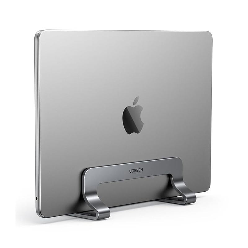 Aluminiowy stojak pionowy marki Ugreen z umieszczonym w nim zamkniętym laptopem Apple, pokazany z graficznym efektem przepływu powietrza po bokach