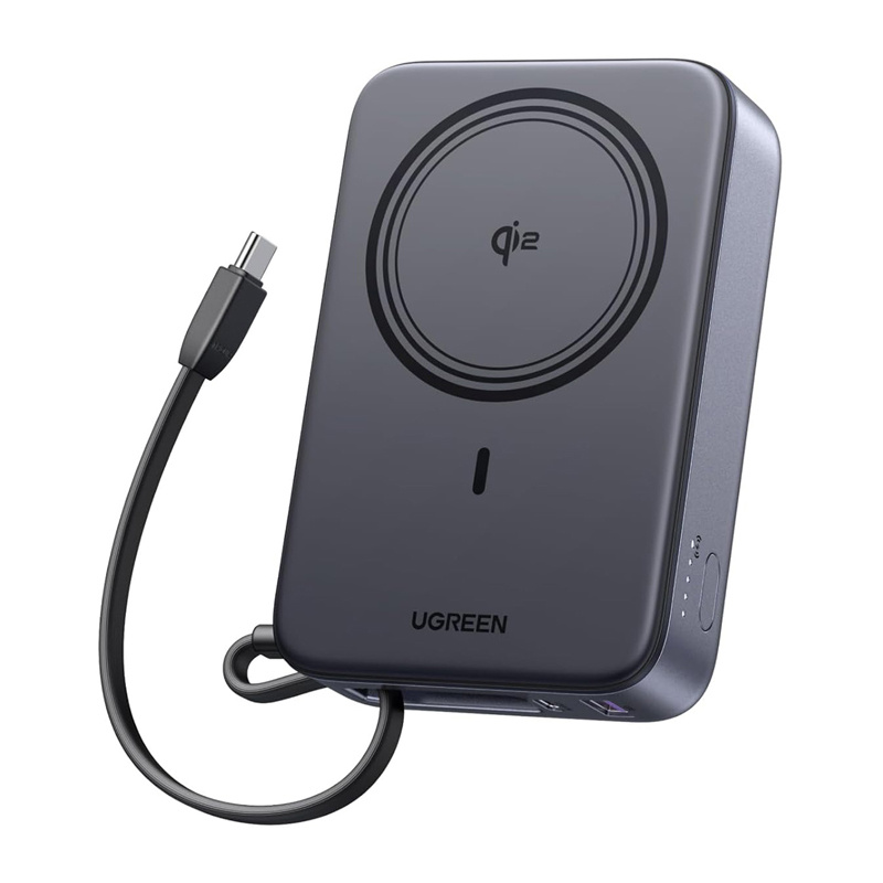Szary powerbank magnetyczny Ugreen ładujący bezprzewodowo smartfona, oraz poprzez kabel smartwatch, słuchawki i tablet