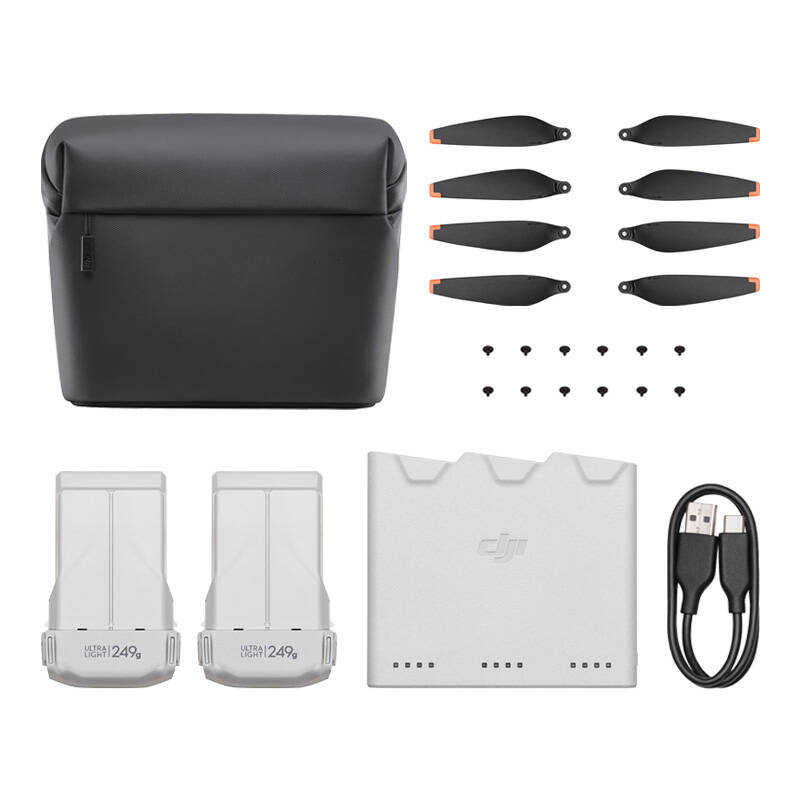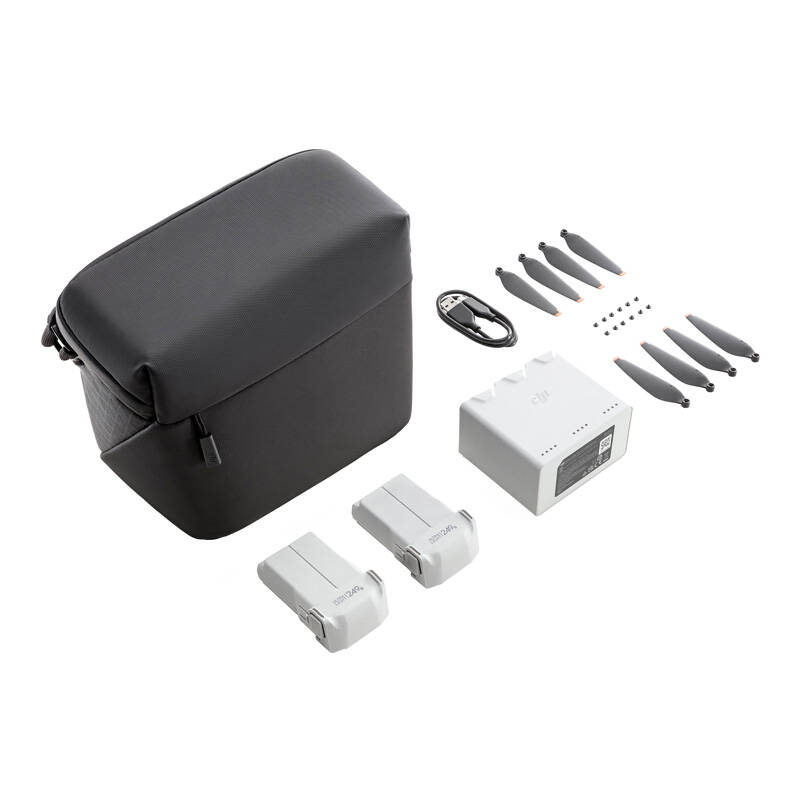 Zestaw DJI Mini 3 Pro Fly More zawiera dwie inteligentne akumulatory do lotu, dwukierunkowy hub ładowania, kabel do transmisji danych, torbę na ramię, zapasowe śmigła i śruby, zapewniając kompleksowe wsparcie podczas fotografowania z lotu ptaka w lepszej cenie niż kupowanie osobno.