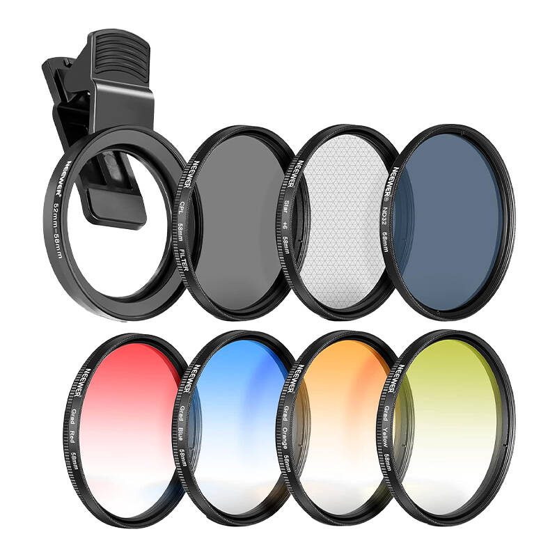 Zestaw filtrów Neewer 58 mm pozwoli Ci podnieść jakość zdjęć na wyższy poziom. Zawiera cztery filtry gradacyjne w kolorach czerwonym, pomarańczowym, żółtym i niebieskim, filtr CPL, filtr ND32, filtr gwiazdkowy oraz klips do mocowania na obiektywie smartfona. Dzięki temu zestawowi możesz uzyskać profesjonalne efekty na swoich zdjęciach, korzystając z aparatu w telefonie lub kamerze z obiektywem 37 mm i 58 mm.